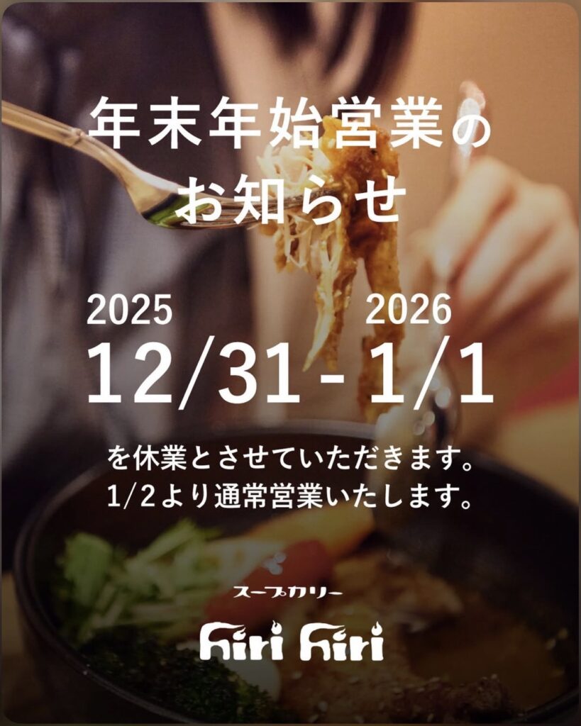 年末年始営業のお知らせ 2025年12月22日 「hirihiri」は、2025年12月31日(水)~2026年1月1日(木)を休業とさせていただきます。 1月2日より通常営業いたします。 今後ともスタッフ一、hirihiriをよろしくお願いいたします。 « 前へ